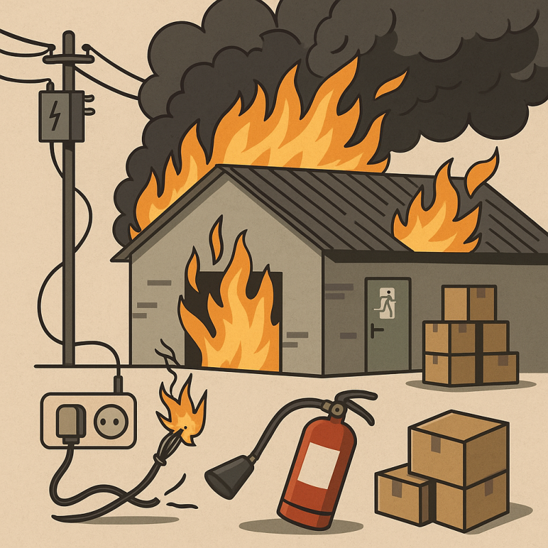 Во время проверки выяснилось, что пожарный выход заставлен коробками, а огнетушители просрочены. Возгорание произошло из-за короткого замыкания, но ущерб вырос в разы из-за невозможности оперативно потушить пожар.