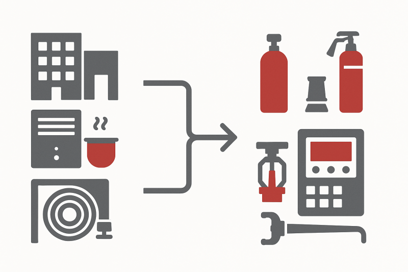 Тип помещения (офис, склад, серверная, кухня, архив) определяет тип системы: водяная, газовая, порошковая, аэрозольная, пенная и т.д.