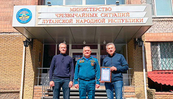 В этот раз в пожарную часть Луганской Народной Республики наши сотрудники лично доставили более 90 огнетушителей, сапоги пожарного, модуль для сушки БОП и пожарно-спасательные веревки.