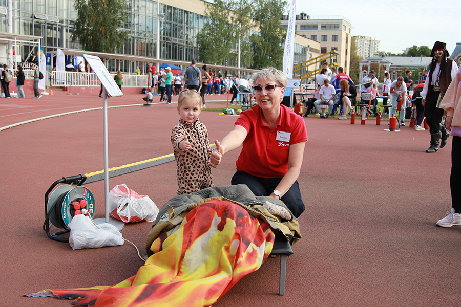 Детвора и взрослые вместе с нашими инструкторами с удовольствием постигали «пожарную» науку. Все дружно учились правильно эвакуироваться из задымлённой палатки, пользоваться самоспасателями, оказывать первую помощь пострадавшим (тут был настоящий аншлаг!), а также попробовали тушить огнетушителем и подручными средствами условный «пожар».