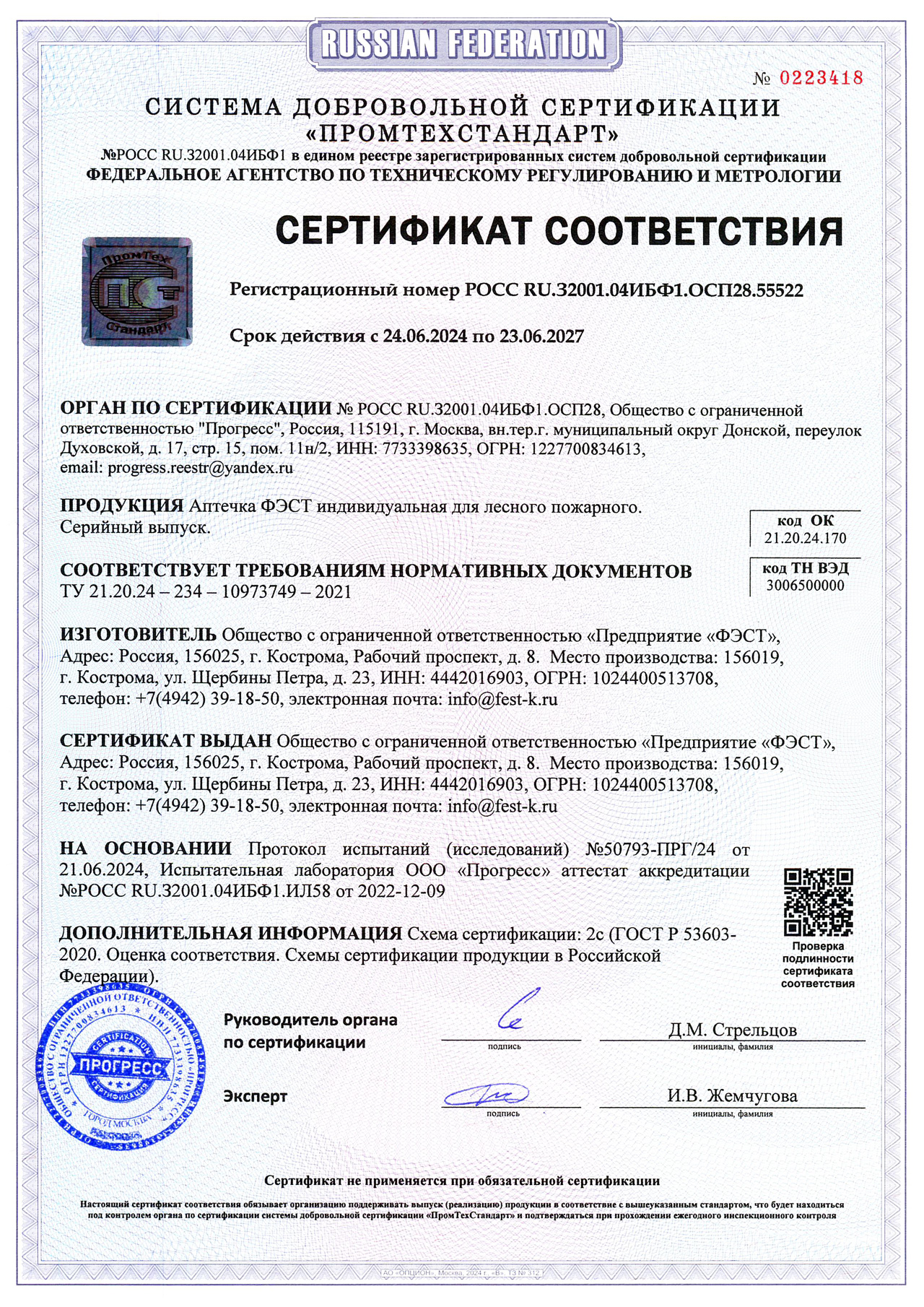 | 6 | Пакет перевязочный медицинский стерильный | 1 шт. |