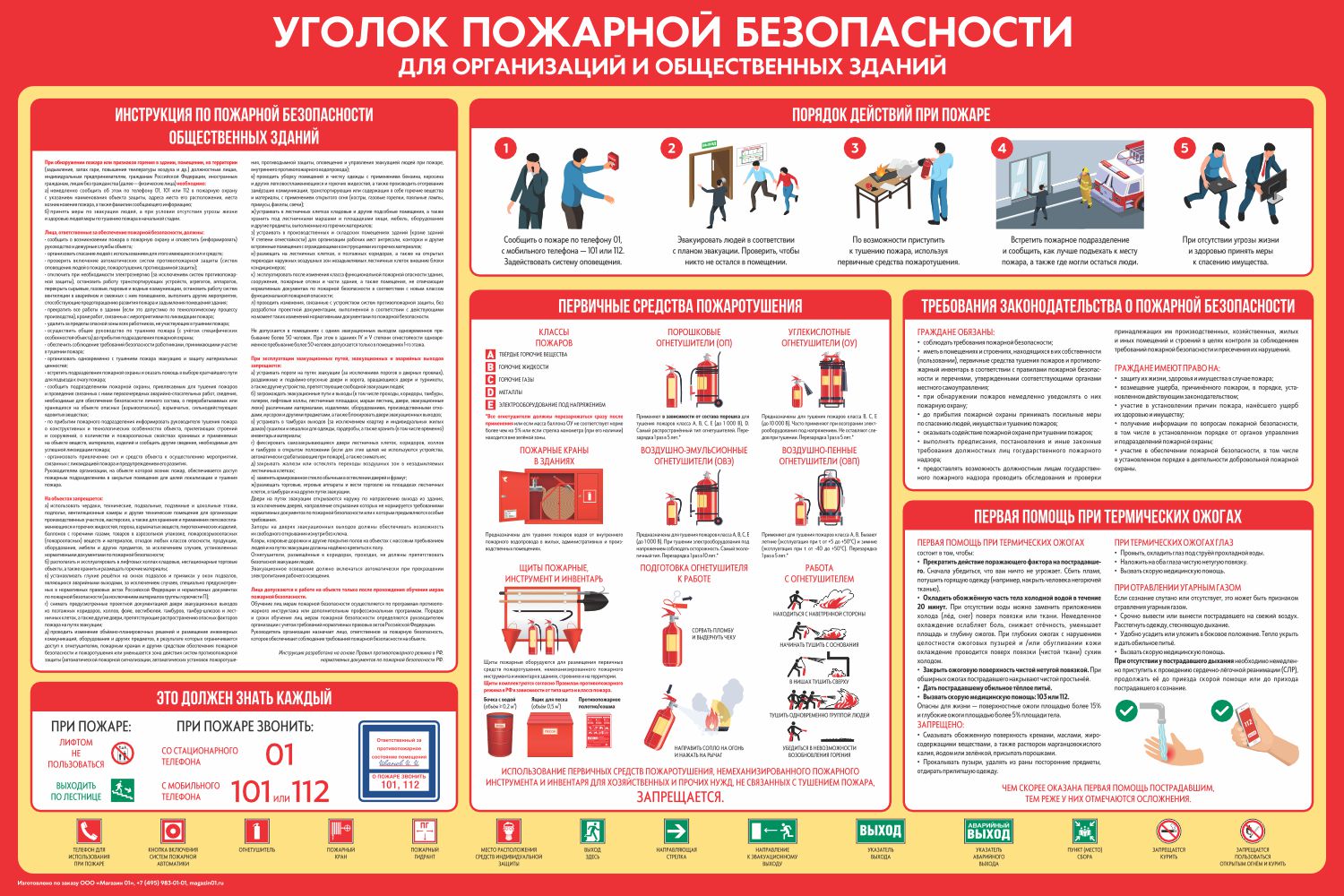 "Уголок пожарной безопасности" предназначен для размещения графической и текстовой информации по пожарной безопасности и безопасности жизнедеятельности профилактического характера, инструкций о мерах пожарной безопасности, противопожарной пропаганды, плана эвакуации, порядка учета пожаров в организации.