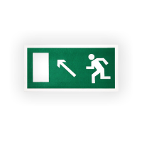 Самоклеящаяся наклейка E06 "Направление к выходу налево вверх" используется на стенах помещений для указания направления движения к эвакуационному выходу по наклонной плоскости (используется совместно с другими знаками пожарной безопасности).