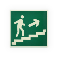 Самоклеящаяся наклейка E15 "Направление к выходу по лестнице вверх (направо)" используется на лестничных площадках и стенах, прилегающих к лестничному маршу (используется совместно с другими знаками пожарной безопасности).