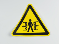 Самоклеящаяся наклейка W23 "Внимание. Опасность зажима" используется на дверцах турникетов и шлагбаумах (используется совместно с другими знаками пожарной безопасности).