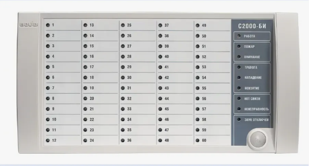 - 60 двухцветных индикаторов, отображающих состояния до 60 разделов пожарной, охранной, технологической сигнализации или исполнительных устройств противопожарного оборудования