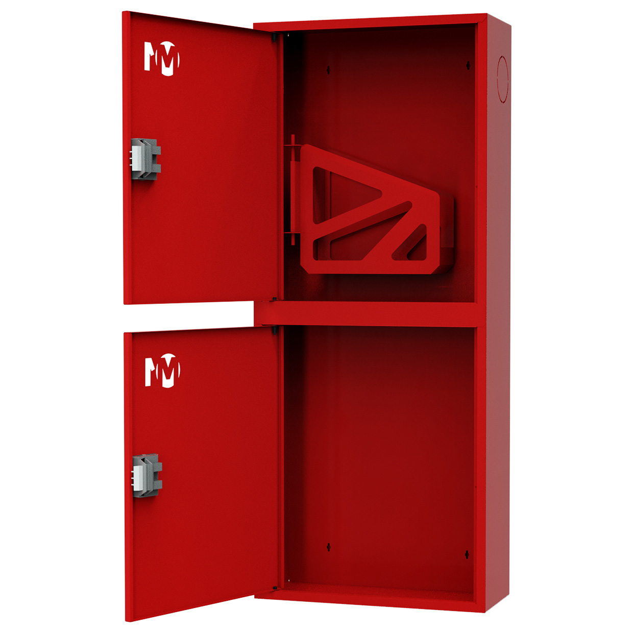 Секции шкафа имеют равные размеры и расположены друг над другом. Верхний отдел комплектуется поворотной корзиной (рукавной кассетой) для одного напорного рукава диаметром от 50 до 66 мм. Нижнее отделение предназначено для хранения двух огнетушителей.