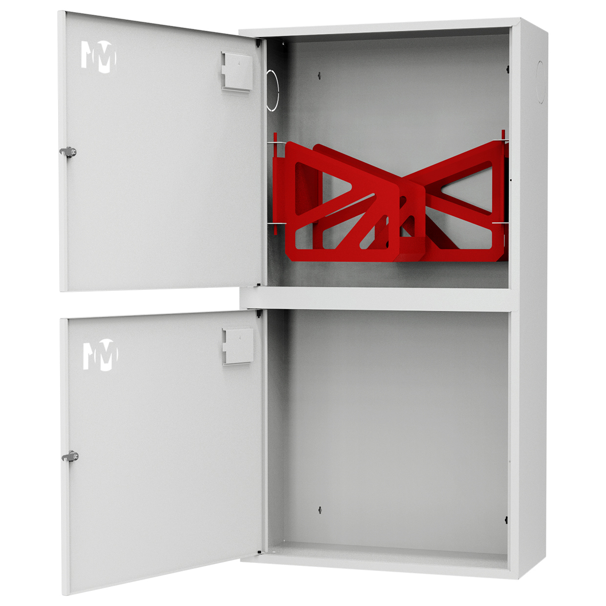 Секции шкафа имеют равные размеры и расположены друг над другом. Верхний отдел комплектуется двумя поворотными корзинами (рукавными кассетами) для двух напорных рукавов диаметром от 50 до 66 мм. Нижнее отделение предназначено для хранения двух огнетушителей.