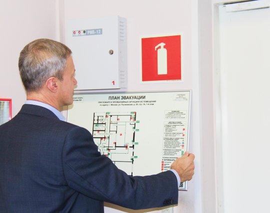 - Обследование объекта (потребности, пути эвакуации, разработка планов эвакуации и пр.)