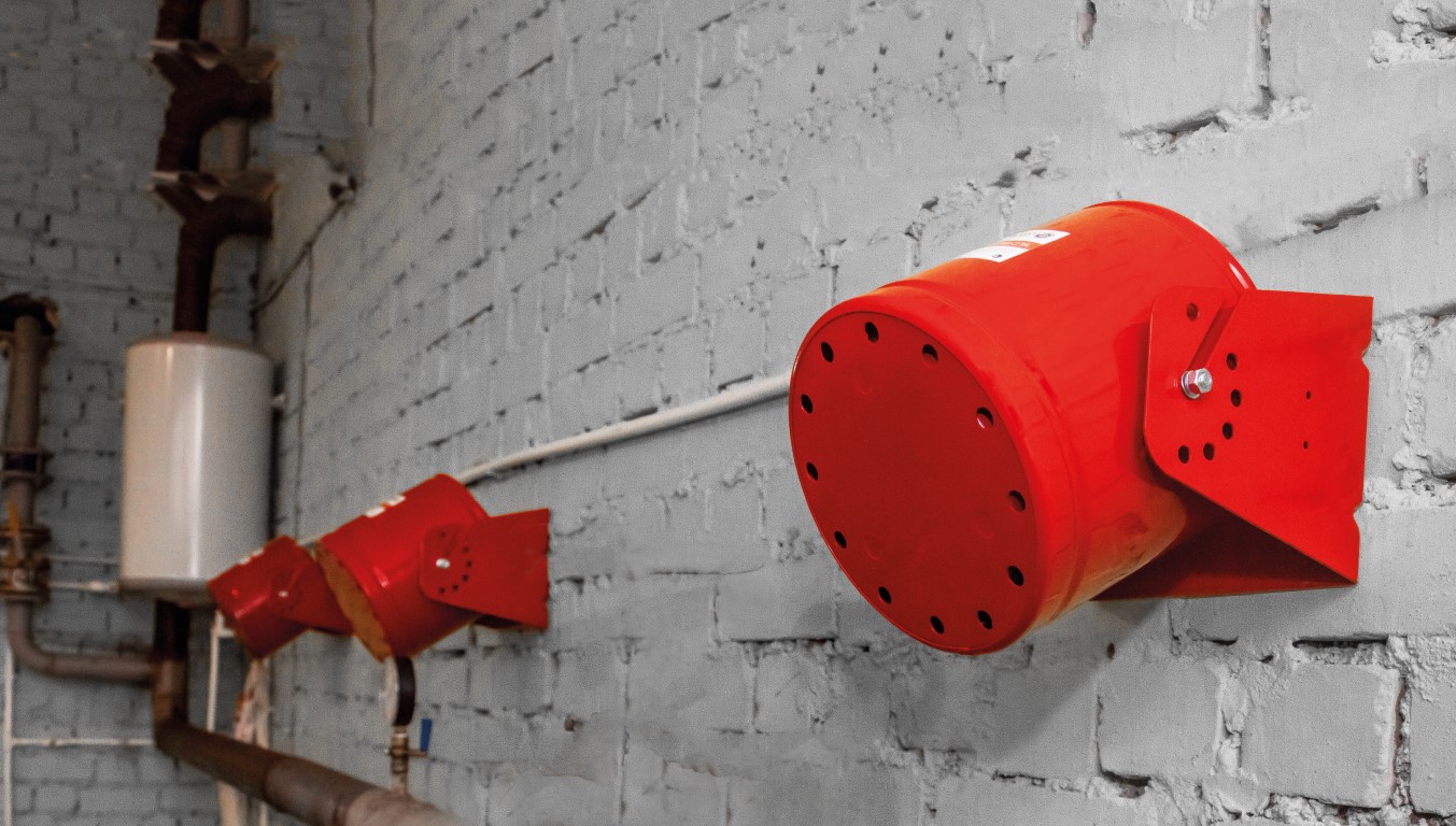 При подаче электрического или теплового импульса на узел запуска, происходит воспламенение твердого аэрозолеобразующего заряда, продукты горения которого выходят через сопла на крышке генератора в защищаемое помещение.