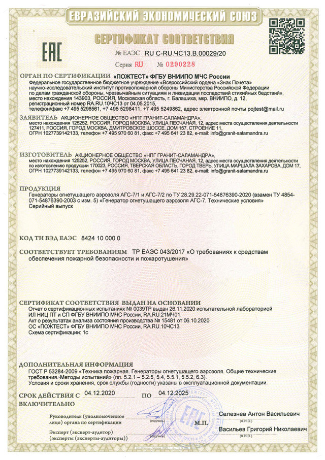 Генератор огнетушащего аэрозоля АГС предназначен для генерирования газо-аэрозольной смеси, необходимая объемная концентрация которой, останавливает процесс пламенного горения. Генератор представляет собой цилиндр с металлическим корпусом, на торце которого расположена сопловая крышка. За счет инжектора, установленного на генераторе, происходит активное перемешивание струи аэрозоля с воздухом, что существенно снижает температуру газо-аэрозольной струи.
