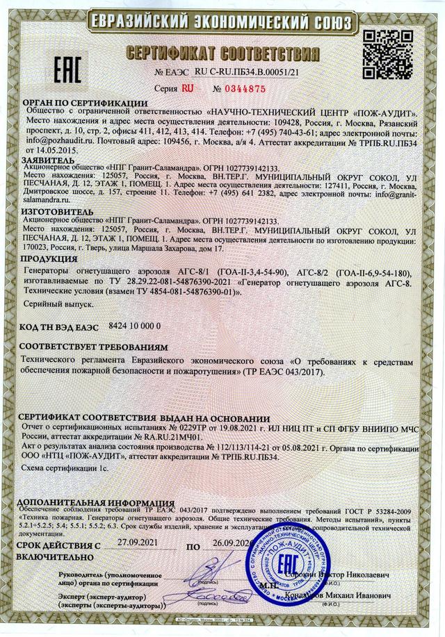 Генератор огнетушащего аэрозоля АГС предназначен для генерирования газо-аэрозольной смеси, необходимая объемная концентрация которой, останавливает процесс пламенного горения. Генератор представляет собой цилиндр с металлическим корпусом, на торце которого расположена сопловая крышка. Фактически является аналогом генератора АГС-7, но за счет лабиринтной конструкции существенно снижена температура выходящей из него газо-аэрозольной струи.