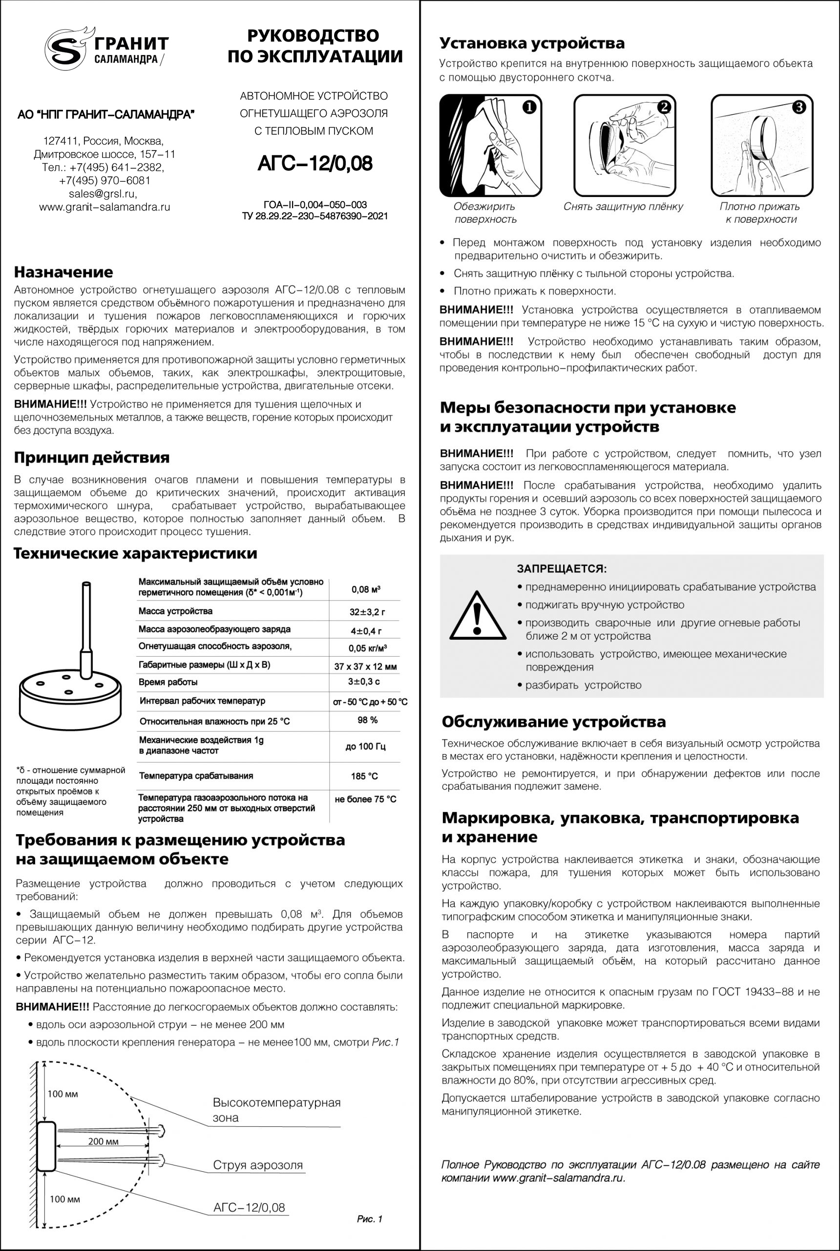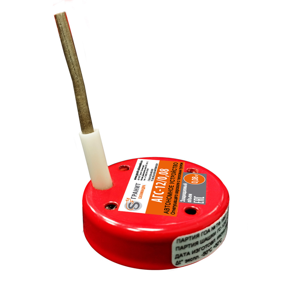 Автономное устройство огнетушащего аэрозоля серии АГС 12/0,08 с тепловым пуском является средством объёмного пожаротушения и предназначено для локализации и тушения пожаров легковоспламеняющихся и горючих жидкостей, твердых горючих материалов и электрооборудования, в том числе находящегося под напряжением.
