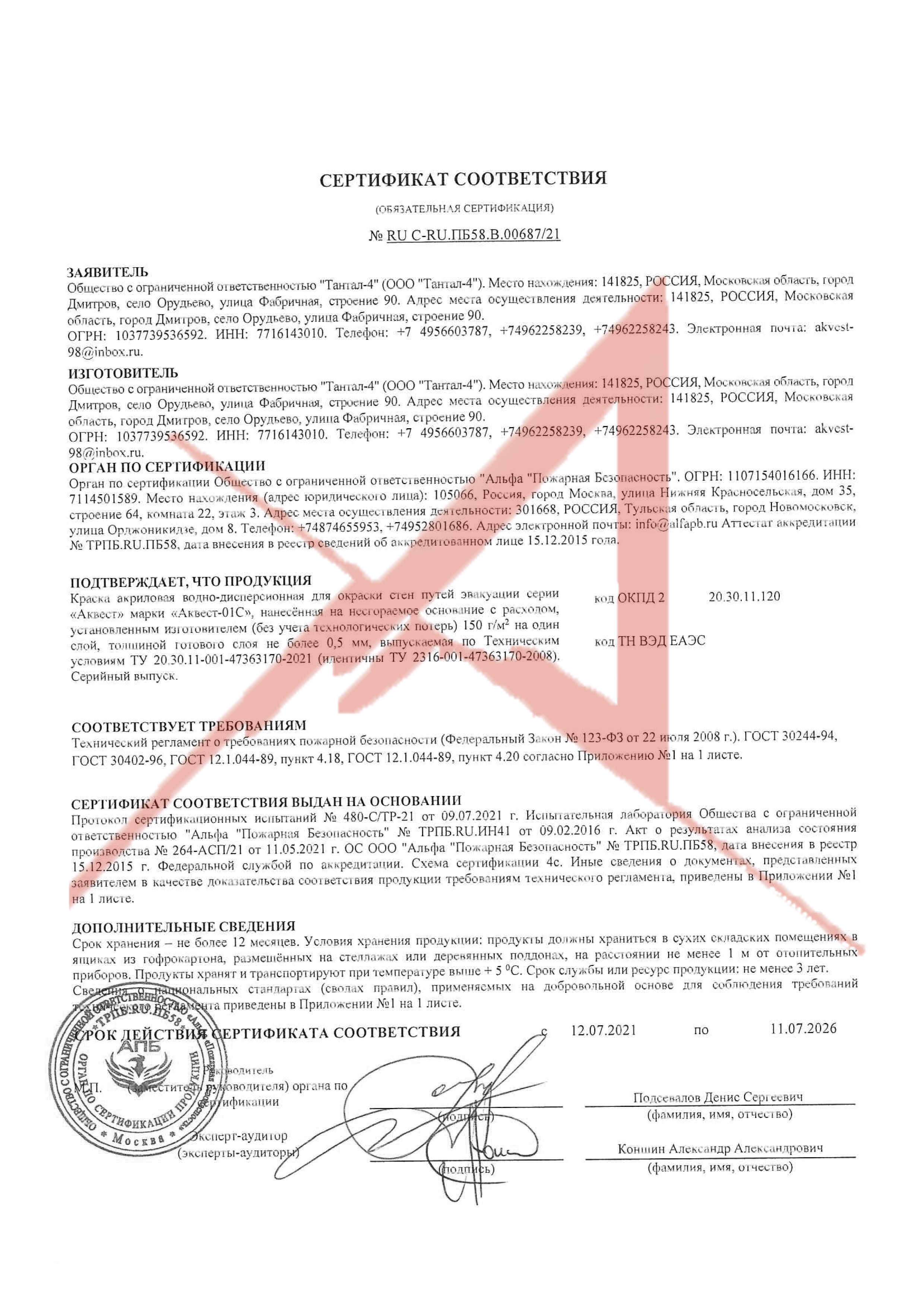 Материал сертифицирован, соответствует установленным требованиям Технического регламента о пожарной безопасности Федерального Закона РФ от 22.07.2008 №123-ФЗ (Г1, В1, Д1, Т1).