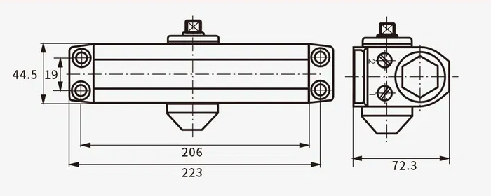Данное устройство устанавливается на верхнюю часть двери и служит для автоматического закрытия двери. Как правило в большинстве случаев используются именно такие двухскоростные доводчики, как серии E-600, для того чтобы при закрытии двери из за усилия доводчика дверь не хлопала по дверной коробке. Т.е. при закрытии используется большая скорость, сменяющаяся на более меньшую когда дверь доходит до непосредственной близости к дверной коробке. Скорости регулируются в зависимости от конкретного случая.
