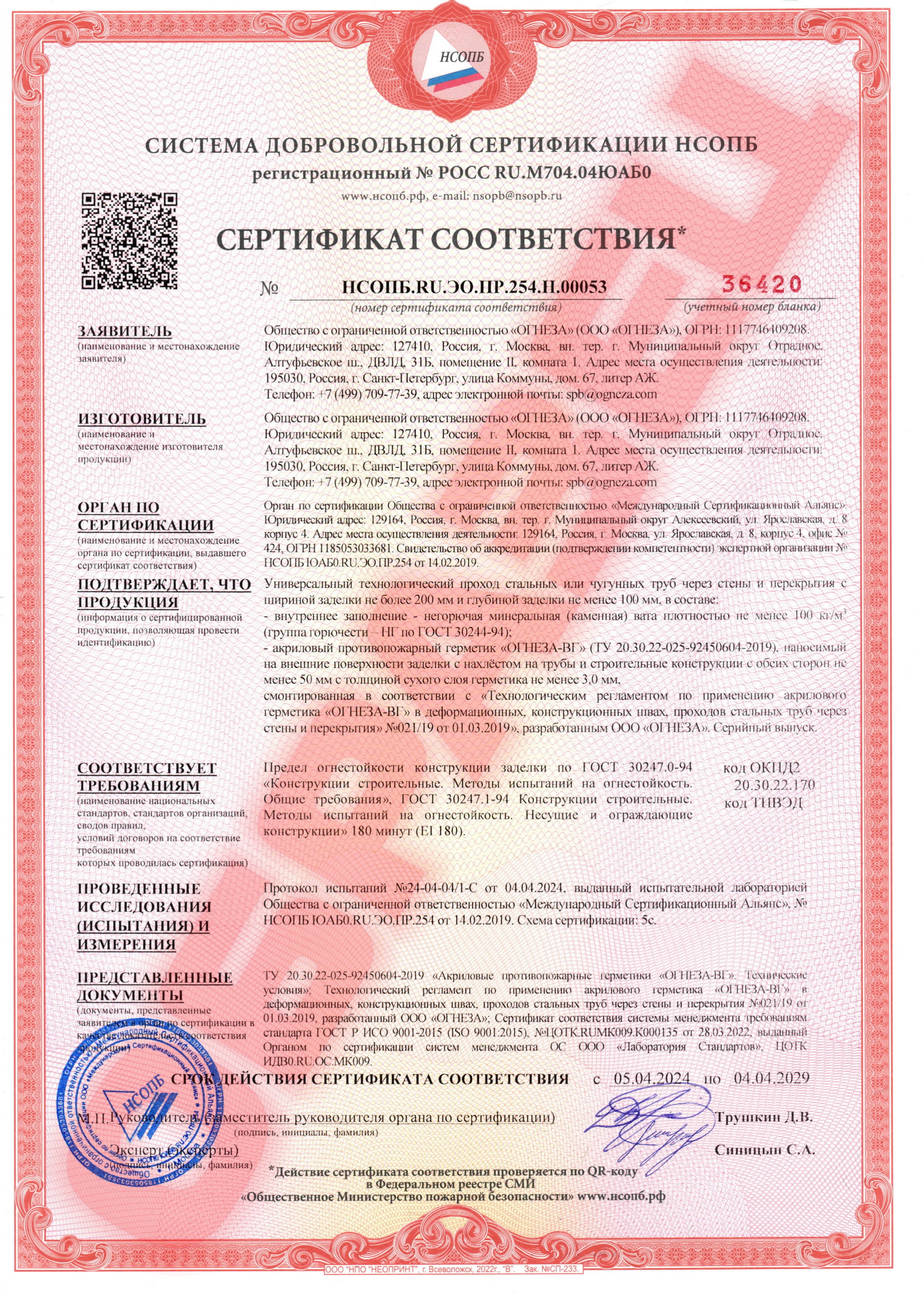 Противопожарный высокоэластичный водостойкий герметик «ОГНЕЗА-ВГ» на акриловой основе предназначен для заделки деформационных швов, универсальных проходок стальных труб и вентиляционных проходок. При воздействии огня высокоэластичный акриловый герметик уплотняется и обеспечивает высокий уровень огнестойкости – до 240 минут.