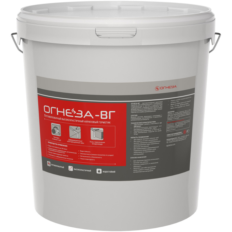 Противопожарный высокоэластичный водостойкий герметик «ОГНЕЗА-ВГ» на акриловой основе предназначен для заделки деформационных швов, универсальных проходок стальных труб и вентиляционных проходок. При воздействии огня высокоэластичный акриловый герметик уплотняется и обеспечивает высокий уровень огнестойкости – до 240 минут.
