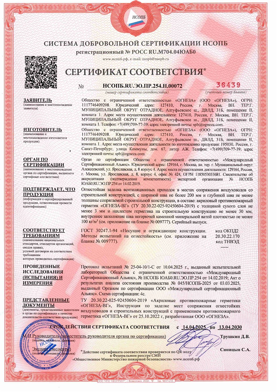 Противопожарный высокоэластичный водостойкий герметик «ОГНЕЗА-ВГ» на акриловой основе предназначен для заделки деформационных швов, универсальных проходок стальных труб и вентиляционных проходок. При воздействии огня высокоэластичный акриловый герметик уплотняется и обеспечивает высокий уровень огнестойкости – до 240 минут.