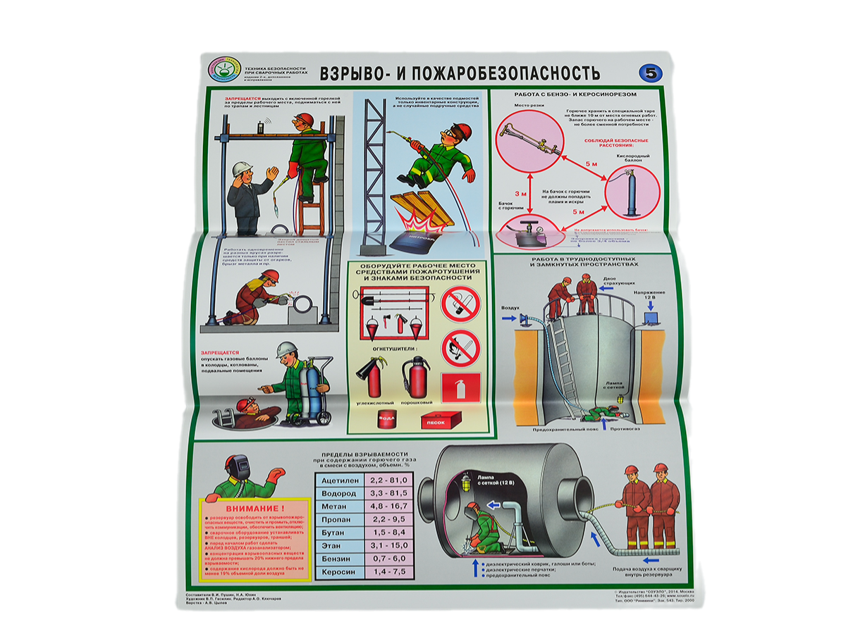 Комплект плакатов "Техника безопасности при сварочных работах" - 5 листов ф. А2 охватывает аспекты сварочных работ, такие, как: