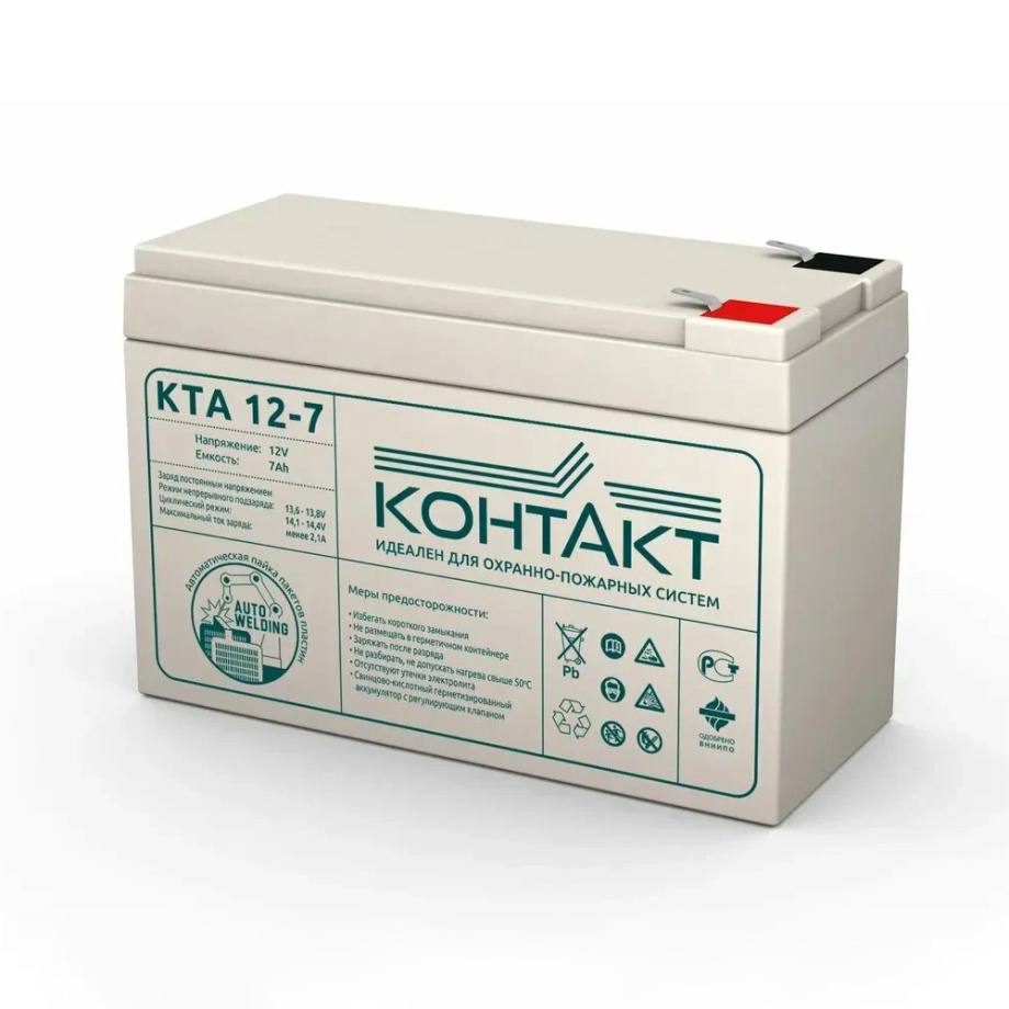 Контакт (КТА) 12-7 – свинцово-кислотный необслуживаемый аккумулятор, выполненный по технологии AGM. Предназначен для работы в режиме непрерывного подзаряда, способен поддерживать циклический.