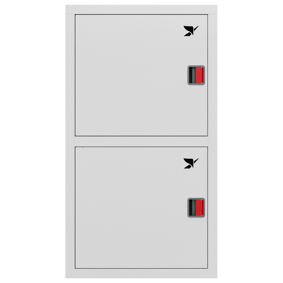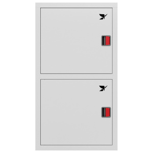 Секции шкафа имеют равные размеры и расположены друг над другом. Верхний отдел комплектуется двумя поворотными корзинами (рукавными кассетами) для одного напорного рукава диаметром от 50 до 66 мм. Нижнее отделение предназначено для хранения двух огнетушителей.