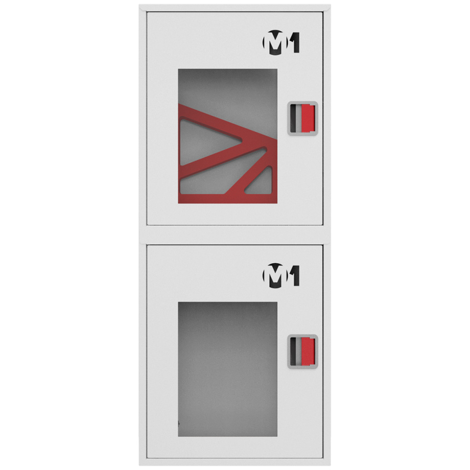 Секции шкафа имеют равные размеры и расположены друг над другом. Верхний отдел комплектуется поворотной корзиной (рукавной кассетой) для одного напорного рукава диаметром от 50 до 66 мм. Нижнее отделение предназначено для хранения двух огнетушителей.