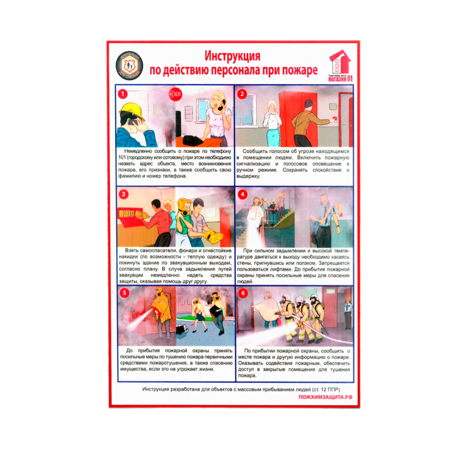 Стенд «Действия персонала в случае пожара» (А4, пластик) содержит информацию для персонала организации, предприятия о том, как нужно вести себя в случае пожара. Информация представлена в виде списка пунктов и понятных всем иллюстраций.
