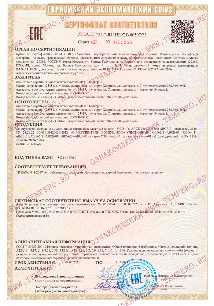 | Состав огнетушащего вещества | ТЕМПЕРО-01 |