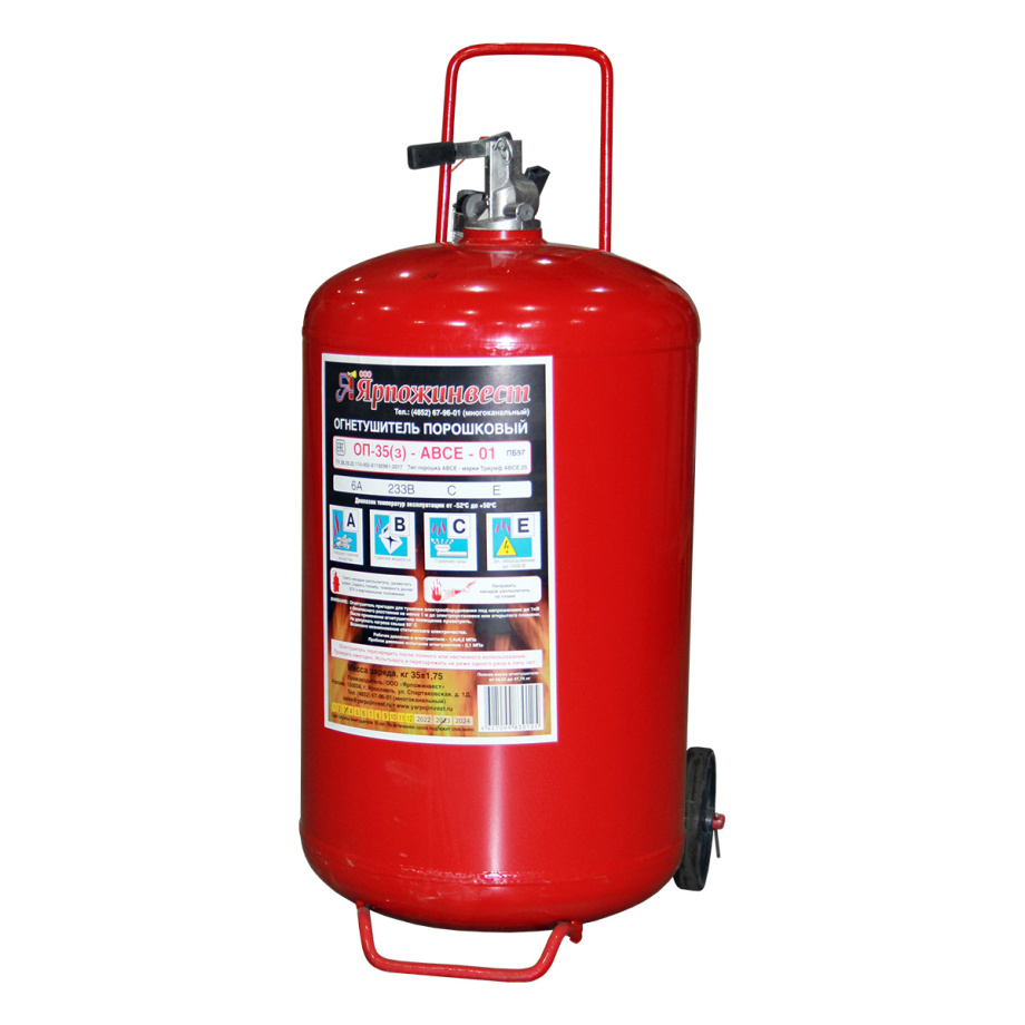 Огнетушитель порошковый передвижной ОП-35 Ярпожинвест (г. Ярославль) - огнетушитель передвижного типа для автозаправок, складских помещений и других объектов. Без перекрывного ствола. Масса заряда огнетушащего вещества - 35 кг. Ранг по модельным очагам: 6А, 233В, С, Е (до 1000В).