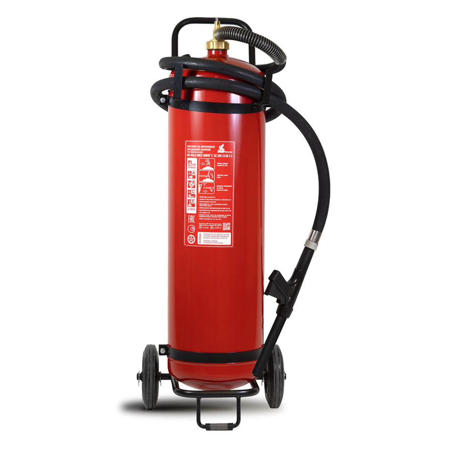Огнетушитель имеет удобную съёмную тележку, обрезиненные 200 мм колеса, морозостойкий резиновый распылитель с защитным пружинным каркасом основания распылителя.