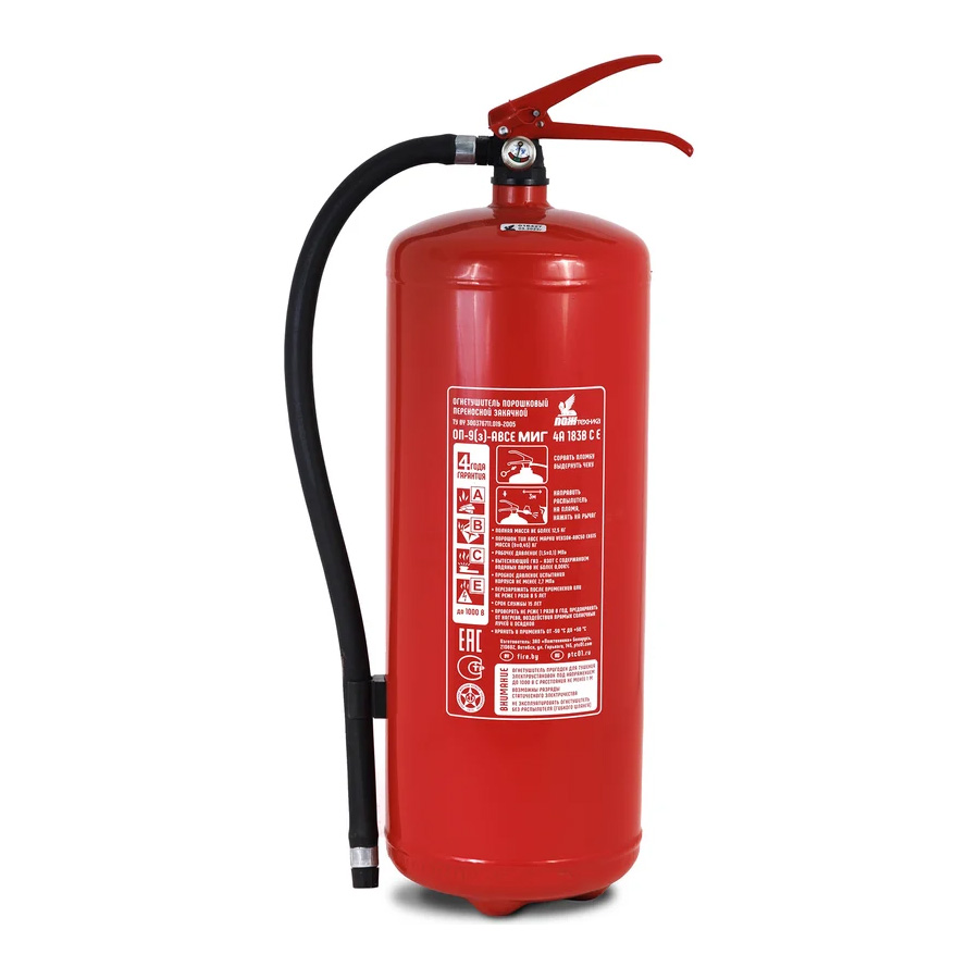 Огнетушитель порошковый ОП-9 МИГ (г. Витебск) - переносной огнетушитель с повышенной тушащей способностью. Масса заряда огнетушащего вещества - 9 кг. Ранг по модельным очагам: 4А, 183В, С, Е (до 1000В).