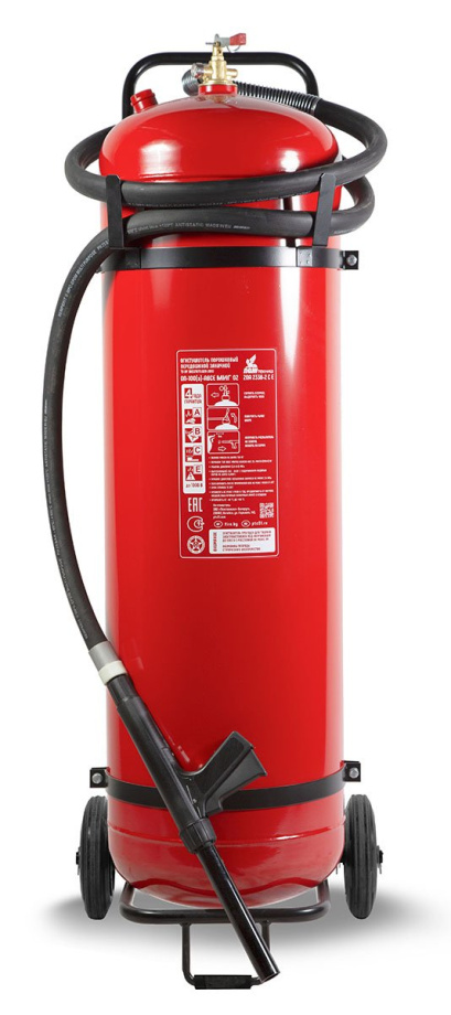 Огнетушитель порошковый ОП-100 МИГ (г. Витебск) - огнетушитель передвижного типа для автозаправок, складских помещений и других объектов. Масса заряда огнетушащего вещества - 100 кг. Ранг по модельным очагам: 20А, 233В-2, С, Е (до 1000В). Комплектуется съемной тележкой с обрезиненными колесами (диаметр - 200 мм), что обеспечивает удобство при перекатывании тяжелого огнетушителя.