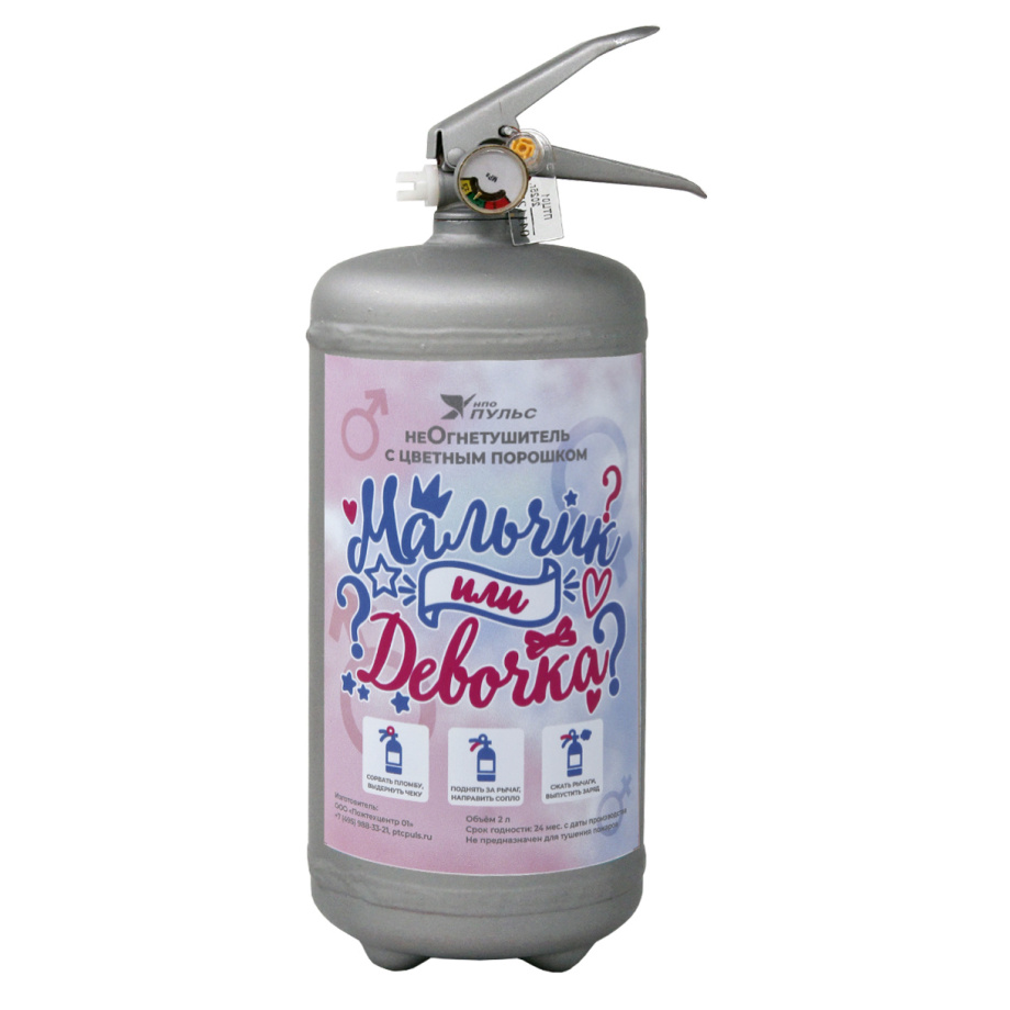 неОгнетушитель для Гендер-пати с цветным дымом. Объем 2 литра. Яркий розовый залп. Баллон серебряного цвета с надписью "Мальчик или Девочка".