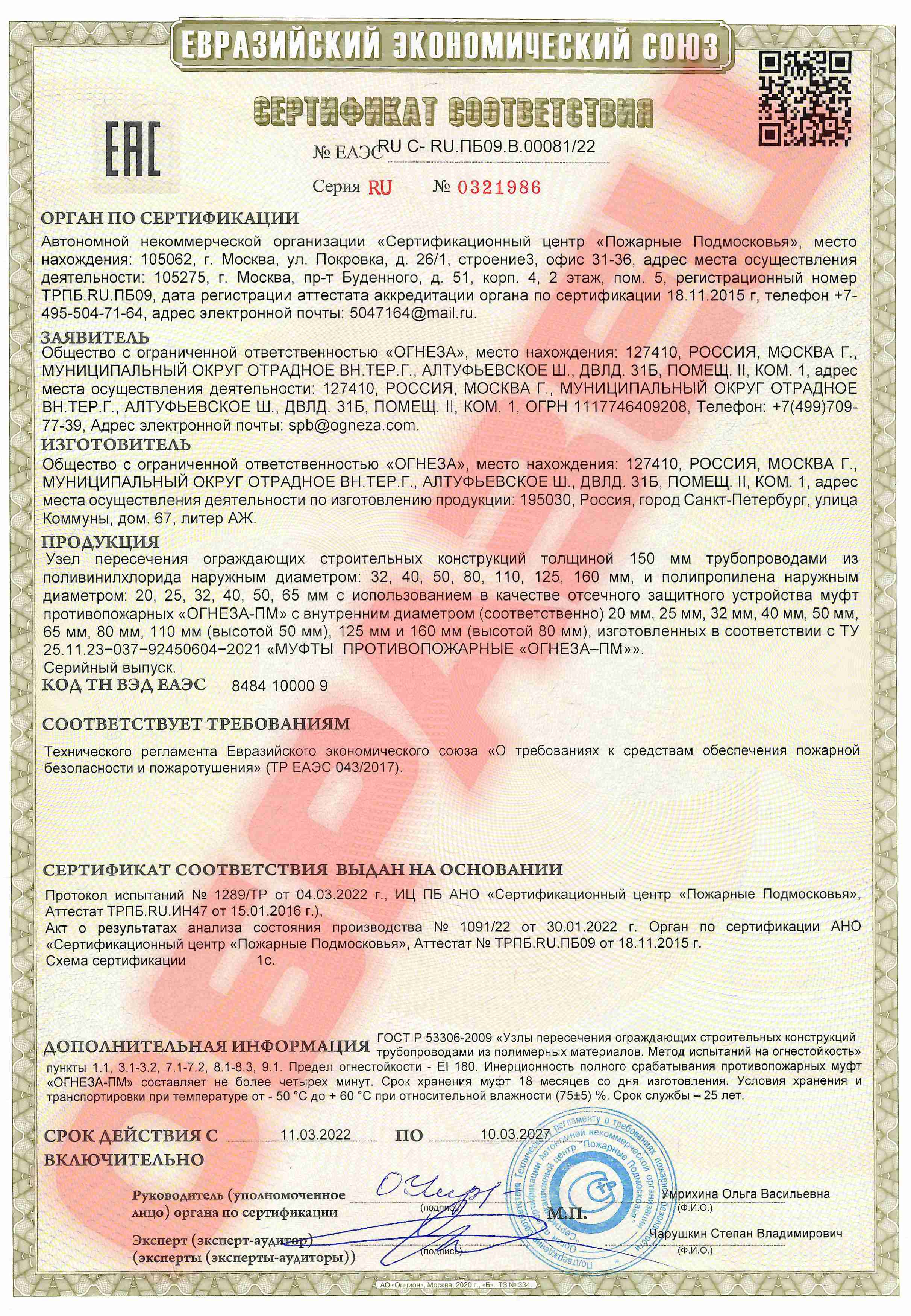 В случае возникновения пожара, под действием высоких температур, муфта срабатывает и перекрывает отверстие в перекрытии (стене) с нормированной степенью огнестойкости до EI-240, резко уменьшая вероятность распространения пожара на соседнее помещение. Муфта работоспособна при монтаже на вертикальные и горизонтальные трубопроводы.