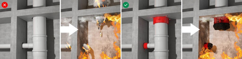 В случае возникновения пожара, под действием высоких температур, муфта срабатывает и перекрывает отверстие в перекрытии (стене) с нормированной степенью огнестойкости до EI-180, резко уменьшая вероятность распространения пожара на соседнее помещение. Муфта работоспособна при монтаже на вертикальные и горизонтальные трубопроводы.