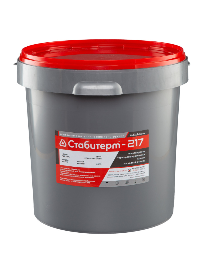 Огнезащитная терморасширяющаяся краска на водной основе Стабитерм-217 — это сложная многокомпонентная система, представляющая собой суспензию интумесцентных наполнителей, различных функциональных добавок и пигментов в водно-дисперсном плёнкообразующем.