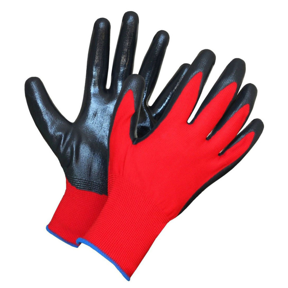 Перчатки нейлоновые с нитрилом красные (с неполным обливом), Высокая стойкость к истиранию, механическим воздействиям, перепадам температур, а также дополнительная стойкость к слабым растворам химикатов