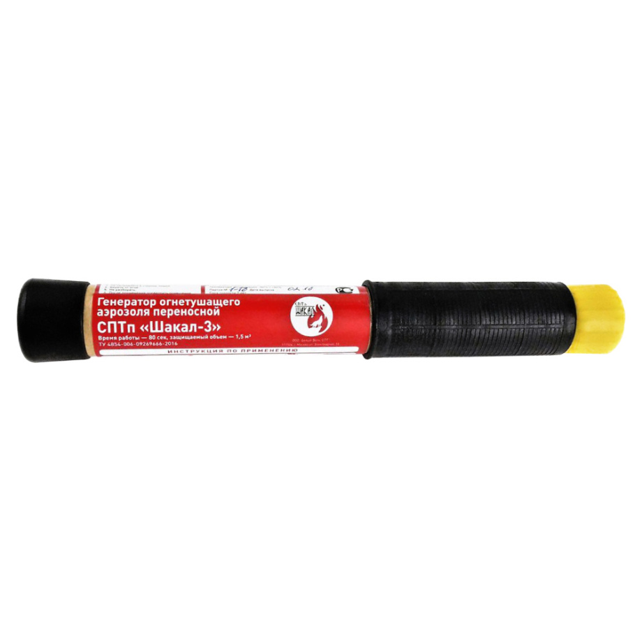 ГОА «Шакал-3» является переносным генератором аэрозольного пожаротушения оперативного применения. Предназначено для тушения небольших очагов пожаров в условно герметичных объемах до 2,1 м³. Устройство может эффективно применяться для тушения пожара не только объемным способом, но и для ликвидации небольших очагов пожаров классов «А» (подкласс «А2»), «В», «С» и «Е» открытого горения по поверхности, на открытой местности и в помещениях.