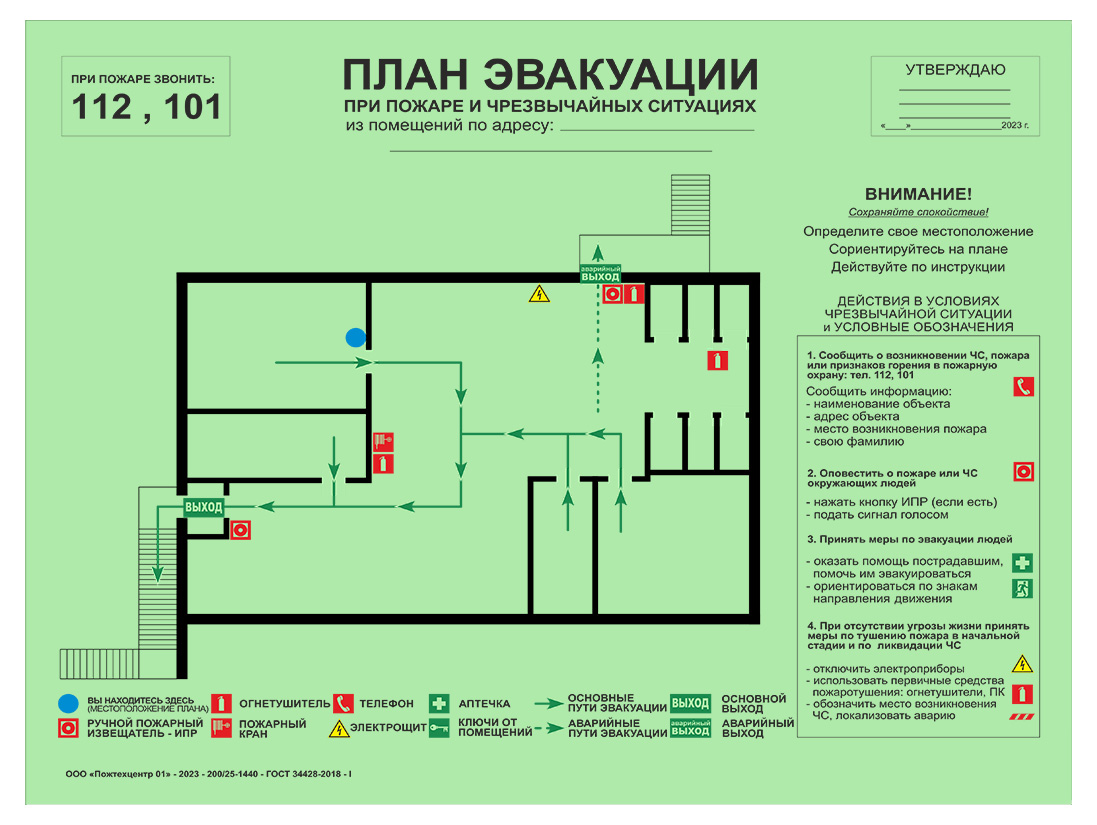 ● Где вешать план эвакуации? – На видном месте: рядом с выходом, в коридоре, холле, фойе и др.