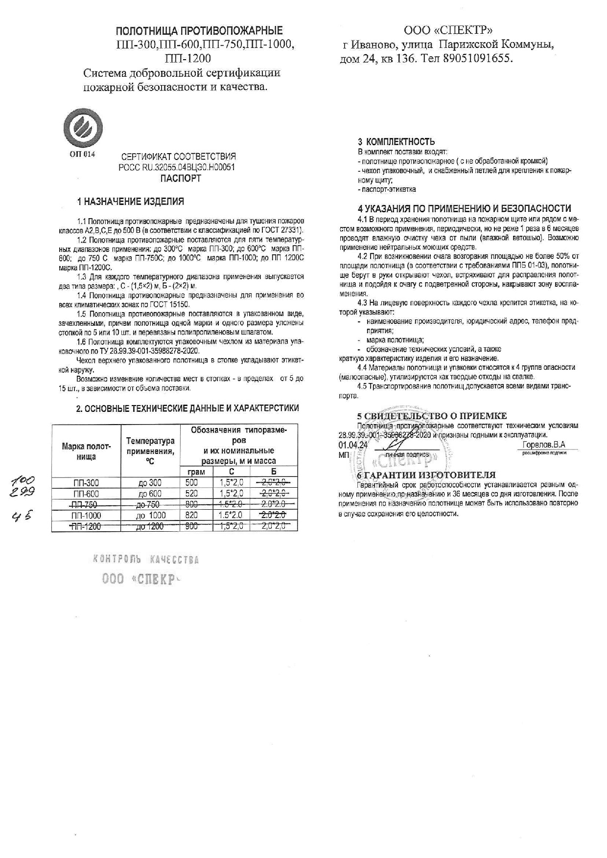 Противопожарное полотно ПП-1000 (1,5х2 м)