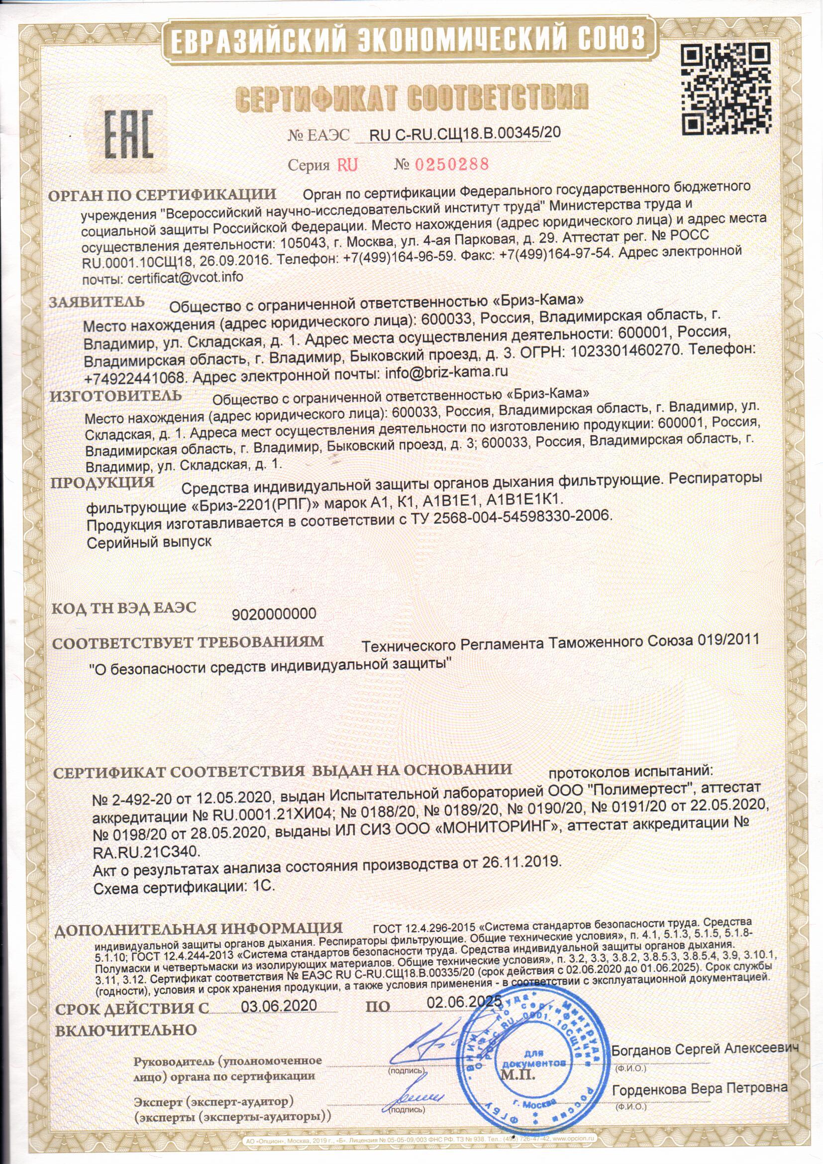 | Гарантийный срок хранения респираторов, лет | 3 |