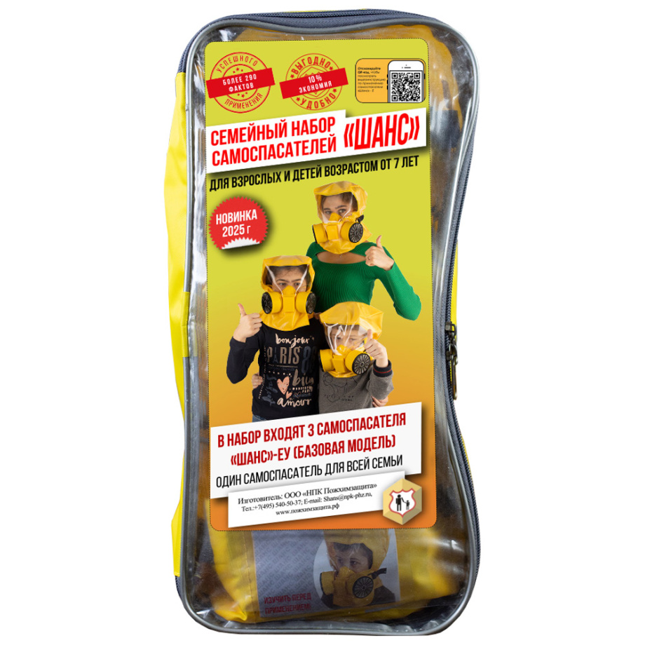 Семейный набор «Шанс» – выгодное и удобное решение для всей семьи. В семейный набор входят 3 самоспасателя «Шанс»-ЕУ в одной сумке для хранения и ношения.