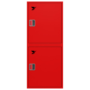 Секции шкафа имеют равные размеры и расположены друг над другом. Верхний отдел комплектуется поворотной корзиной (рукавной кассетой) для одного напорного рукава диаметром от 50 до 66 мм. Нижнее отделение предназначено для хранения двух огнетушителей.