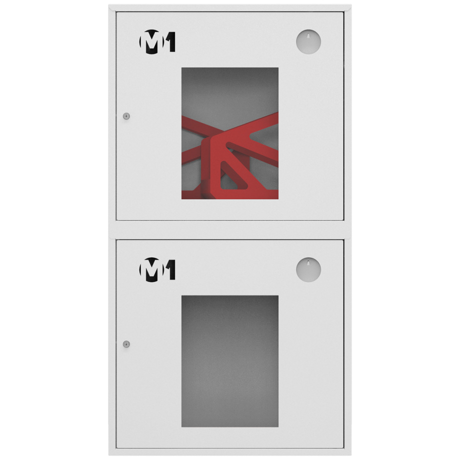 Секции шкафа имеют равные размеры и расположены друг над другом. Верхний отдел комплектуется двумя поворотными корзинами (рукавными кассетами) для двух напорных рукавов диаметром от 50 до 66 мм. Нижнее отделение предназначено для хранения двух огнетушителей.