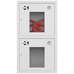 Секции шкафа имеют равные размеры и расположены друг над другом. Верхний отдел комплектуется двумя поворотными корзинами (рукавными кассетами) для двух напорных рукавов диаметром от 50 до 66 мм. Нижнее отделение предназначено для хранения двух огнетушителей.