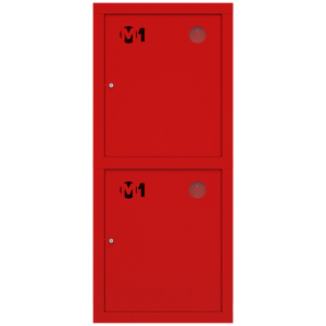 Секции шкафа имеют равные размеры и расположены друг над другом. Верхний отдел комплектуется поворотной корзиной (рукавной кассетой) для одного напорного рукава диаметром от 50 до 66 мм. Нижнее отделение предназначено для хранения двух огнетушителей.