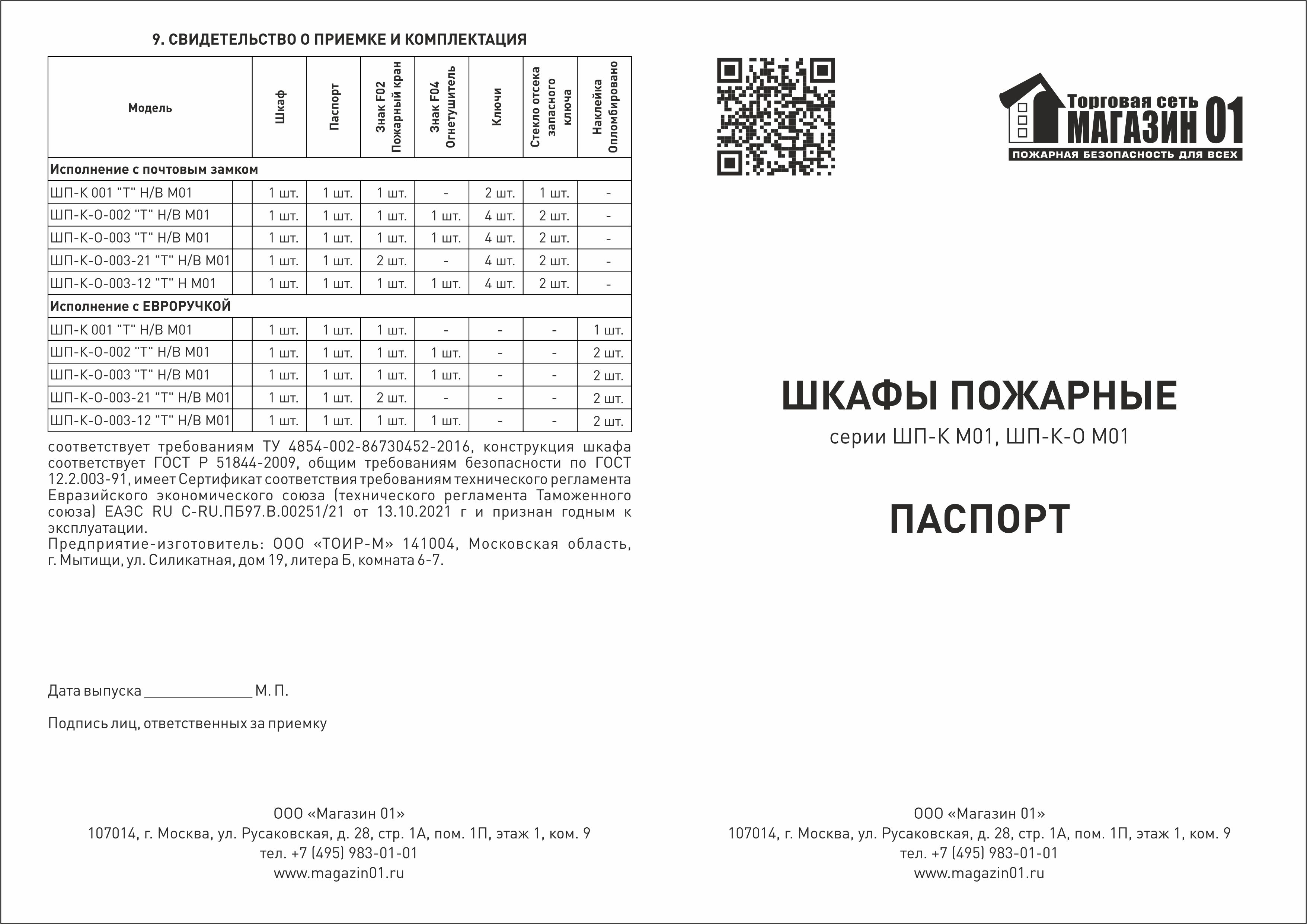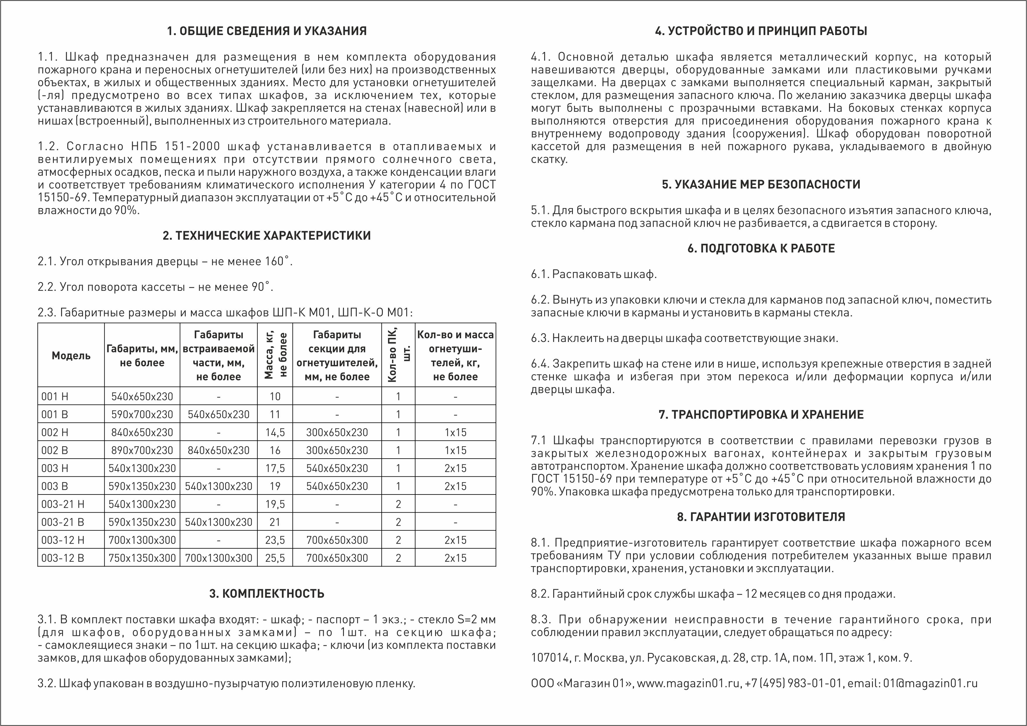 В комплект поставки шкафа "М01" входит: