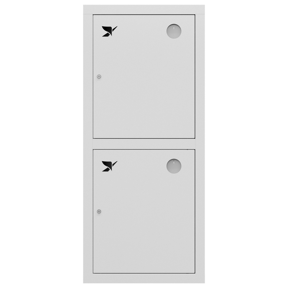 Снабжен глухими дверцами без смотровых окон с почтовыми замками и карманами для хранения ключей. Окрашен прочным полимерным покрытием белого цвета.