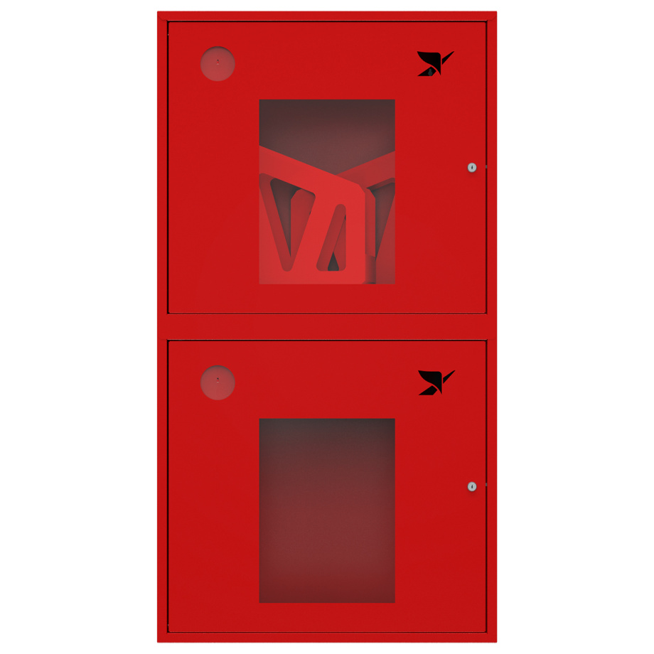 Секции шкафа имеют равные размеры и расположены друг над другом. Верхний отдел комплектуется двумя поворотными корзинами (рукавными кассетами) для двух напорных рукавов диаметром от 50 до 66 мм. Нижнее отделение предназначено для хранения двух огнетушителей.