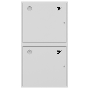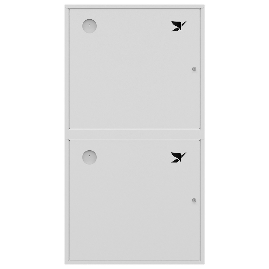 Снабжен глухими дверцами без смотровых окон с почтовыми замками и карманами для хранения ключей. Окрашен прочным полимерным покрытием белого цвета.